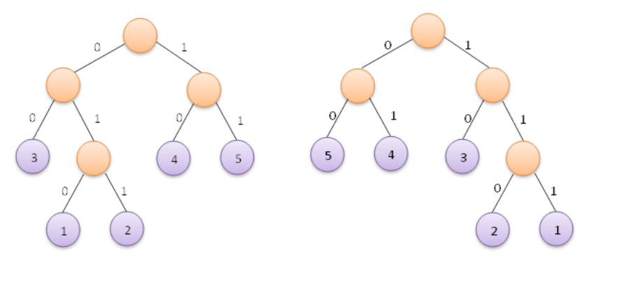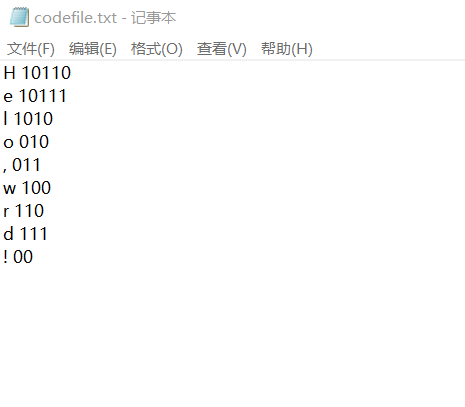 voidHuffmanCoding(HuffmanTree HT, HuffmanCode &HC, int n) { HC = (HuffmanCode)malloc(n * sizeof(char *)); if (!HC) { printf("HuffmanCode request memory failed!"); exit(-1); } char *code = (char *)malloc(n * sizeof(char)); if (!code) { printf("code malloc faild!"); exit(-1); } code[n - 1] = '\0'; int i; for (i = 0; i < n; i++) { int current = i; int father = HT[i].parent; int start = n - 1; while (father != -1) { if (HT[father].lchild == current) code[--start] = '0'; else code[--start] = '1'; current = father; father = HT[father].parent; } HC[i] = (char *)malloc((n - start) * sizeof(char)); if (!HC[i]) { printf("HC[i] malloc faild!"); exit(-1); } strcpy(HC[i], code + start); } FILE *file = fopen("codefile.txt", "w"); if (NULL == file) { cout << "open error!\n"; } cout << "----------------------编码如下--------------------------" << endl; for (int i = 0; i < n; ++i) { printf("%c %s\n",HT[i].value,HC[i]); fprintf(file, "%c %s\n", HT[i].value, HC[i]); } fclose(file); free(code); cout << "已编码并写入文件codefile.txt" << endl; cout << "-----------------------------------------------------------" << endl; }